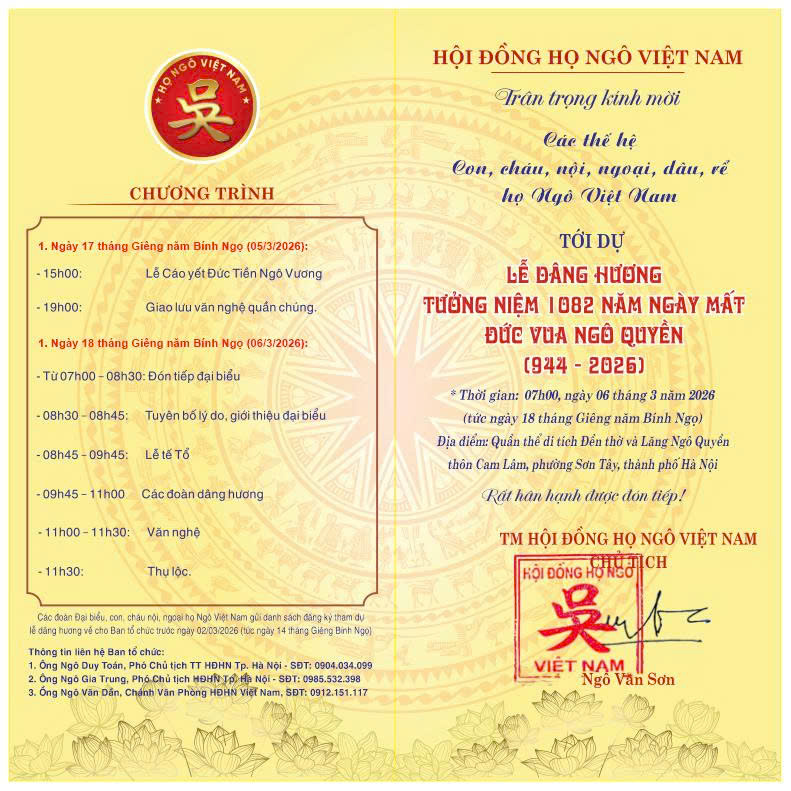 Các đoàn đại biểu, con cháu nội, ngoại họ Ngô Việt Nam gửi danh sách đăng ký tham dự Lễ dâng hương về Ban Tổ chức trước ngày 02/3/2026 (tức ngày 14 tháng Giêng năm Bính Ngọ).